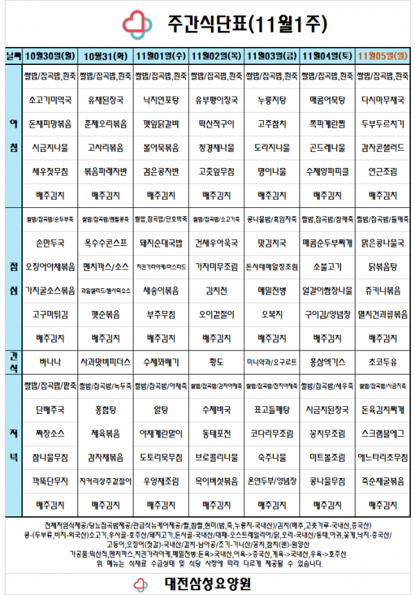 11월 1주차 식단표입니다.