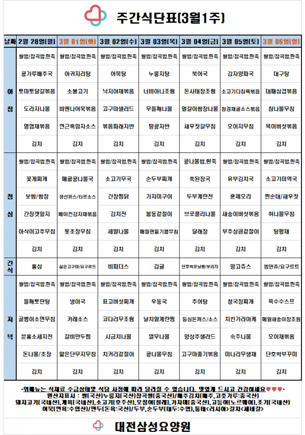 홈 > 프로그램 > 주간식단표-삼성요양원